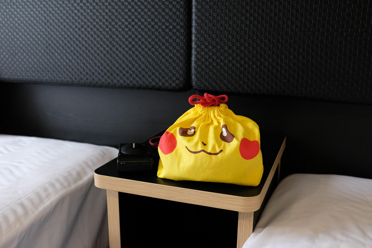 旅行や温泉に行くときに持っていくピカチュウ巾着。きゅっと絞った時の顔がたまらん。