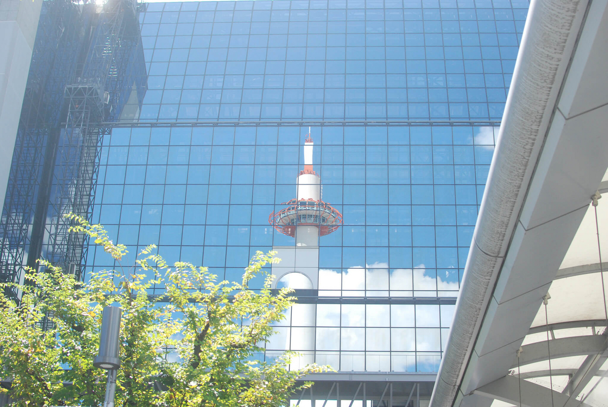 京都タワーが京都駅に反射して映っていて、なかなかてっぺんまでが見られず位置を変えて追いかけた。